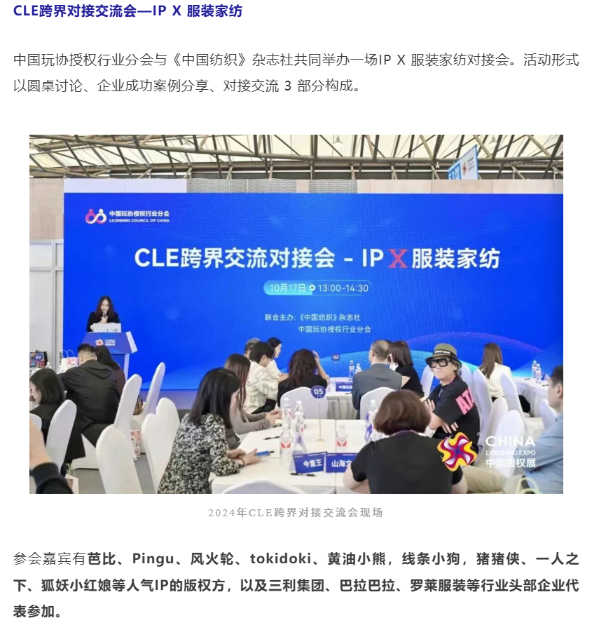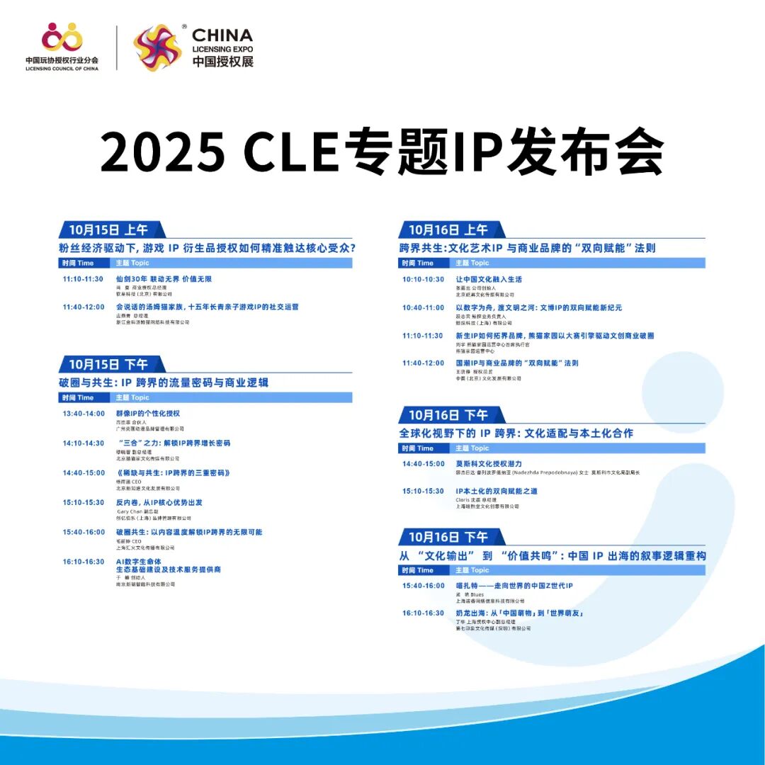 CLE专题IP发布会邀请卡通动漫、潮流时尚、艺术文化、电子游戏等多元品类的IP授权企业高层,现场分享IP授权的前沿趋势、爆款打造策略等。