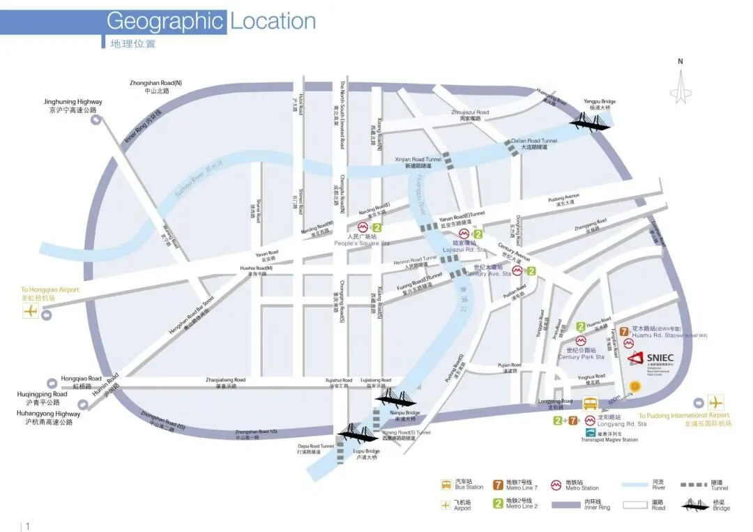 上海新国际博览中心(SNIEC)坐落于上海浦东经济与工业核心发展区。地铁7号线可直达SNIEC,其花木路站紧邻上海新国际博览中心W5号展厅。此外,大型交通枢纽中心—龙阳路站(位于龙阳路上)距离SNIEC仅600余米,地铁2号线、地铁7号线、磁浮列车、以及多条公交线路交汇于此,由龙阳路站步行10分钟,即可抵达SNIEC。