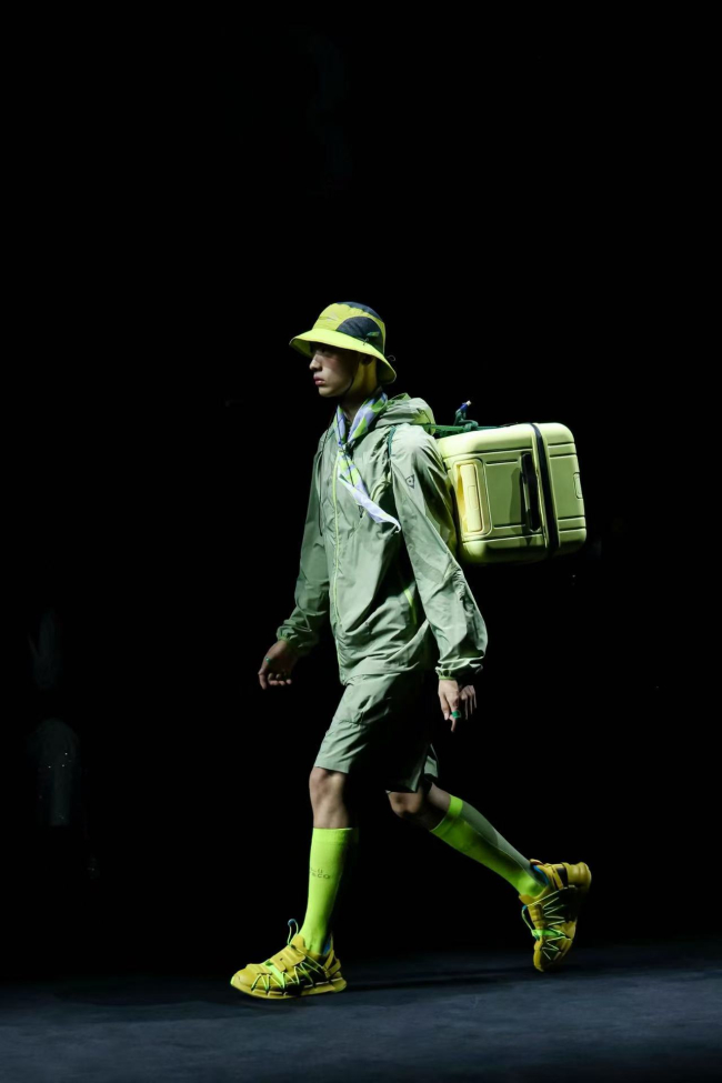 “文明胶囊” 系列以人类文明探索为灵感,衣身极光般的渐变效果与符号光影交织,暗含对“科技与文明关系” 的思考;“幻化异维” 系列则以可拆卸袖管外套、可收纳腰包马甲等可变形结构,与 NINETYGO 箱包形成场景联动,箱包承载生活,共同构建起年轻人 “全天候、全场景” 的出行美学体系。既延续实用主义核心,更传递“轻盈应对生活变化” 的态度。