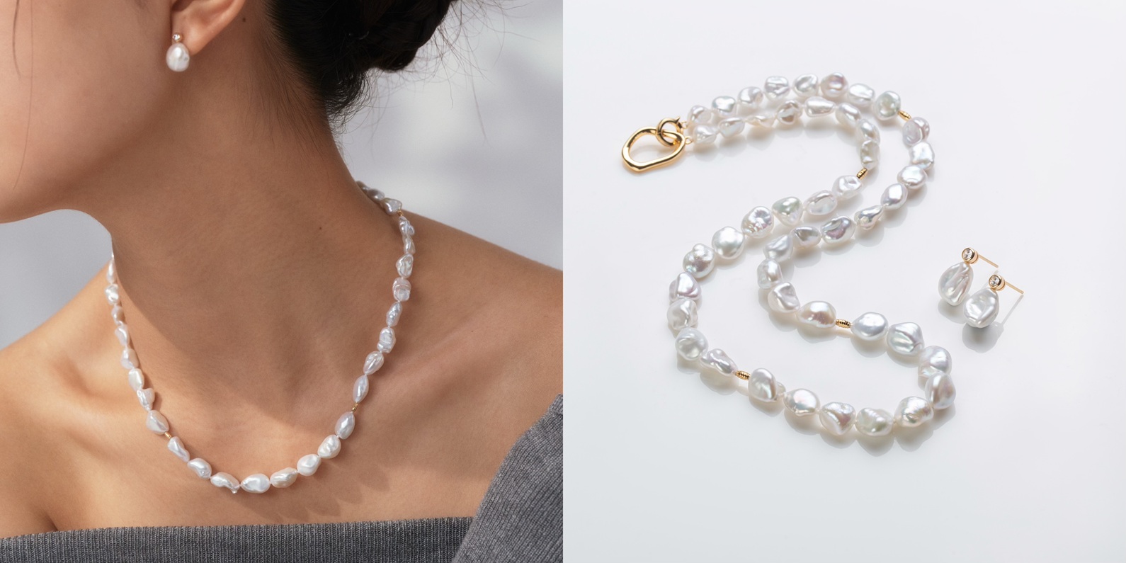 现代雕塑强调形态的自由与唯一性,这一点在MiNG名皇珠宝「自由假日Keshi套组」中表现得淋漓尽致。Keshi珍珠本身不规则、独一 无二的形态,为这款项链及耳钉赋予了天然的抽象感。设计师没有对其进行过多的修饰,而是巧妙地保留了珍珠的原始形态,让它们自由组合。不规则扣环设计与珍珠形态相呼应,整体呈现出随性而不失张力的美感,正如一件现代雕塑作品,轻盈、灵动,充满个性表达。