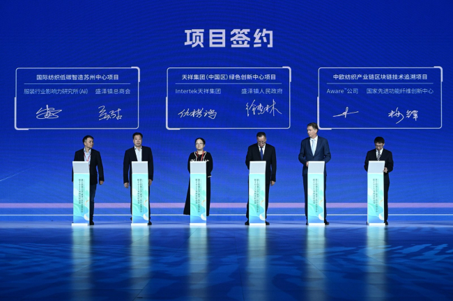 活动现场还举行了三大项目签约。天祥集团与盛泽镇人民政府合作打造天祥集团(中国区)绿色创新中心项目,为纺织企业提供国际通用的快检、认证、评估一站式服务;Aware公司与国家先进功能纤维创新中心合作打造中欧纺织产业链区块链技术追溯项目,实现国内供应链与国际标准的无缝对接;服装行业影响力研究所(Aii)与盛泽镇总商会合作打造国际纺织低碳智造苏州中心项目,建立国际认可的碳数据管理与信用体系,助力企业低碳转型。