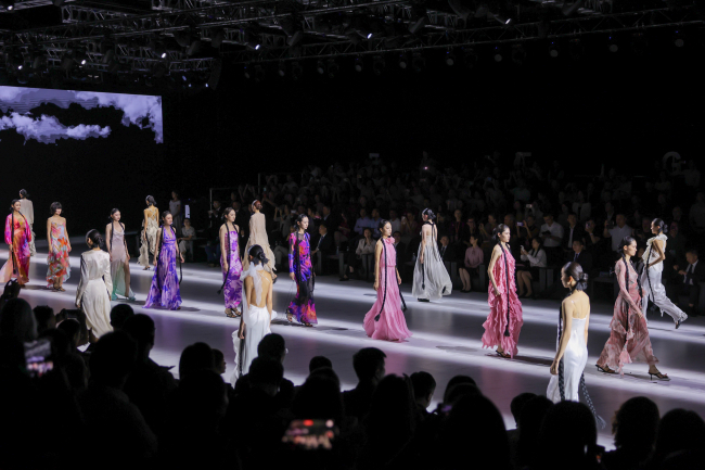 植序、身体与衣料,在流动中彼此生成。“共生”以自然肌理为谱,轻纱如海雾,手撕垂缕似礁岸藻羽,褶裥与斜裁让行走成为风的雕刻。半透与缎面并置,随机与秩序互为平衡,营造像生态系统般自我调和的韵律。