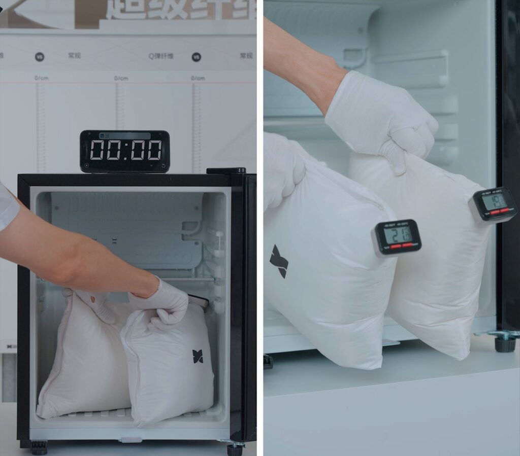 将处于相同温度环境下的“暖芯纤维”制成的科技棉包和90绒子含量制成的羽绒包,同时放入冰柜中,8分钟以后,分别查看包裹在两者中间的温度计的指数,可以看出“暖芯纤维”保暖效果可媲美90绒。