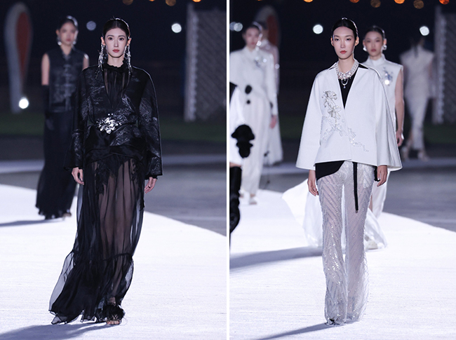 上久楷的国风“高定”大秀《宋·潮》系列以宋代“格物致知”的哲学为精神内核,通过“黑、白、粉、杏仁油、晴霁绿”五色与分层织造工艺,完成了一场传统与未来的深度对话。“通过工艺革新、材质革新、潮玩叙事、极简穿搭等实践,我们希望将‘博物馆里的非遗’转化为‘可触摸、可感知、可共鸣’的东方生活美学。”苏州上久楷丝绸科技文化有限公司总经理吴振飞介绍。