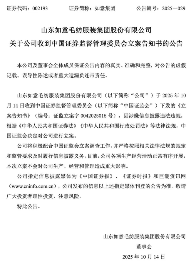 2025年10月14日晚间,如意集团(002193.SZ)公告称,公司于2025年10月14日收到中国证监会下发的《立案告知书》,因涉嫌信息披露违法违规,根据相关法律法规,中国证监会决定对公司进行立案。如意集团再次成为资本市场关注的焦点。