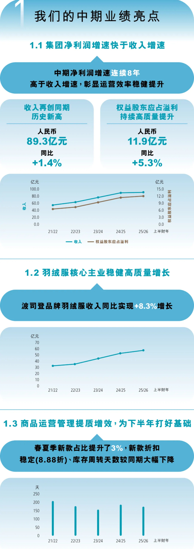 在服装行业面临多重挑战的市场环境下,波司登国际控股有限公司交出了一份稳健的中期成绩单。截至2025年9月30日止的六个月内,公司实现收入89.28亿元人民币,同比增长1.4%,创下中期业绩的历史新高。更值得关注的是,其盈利能力持续增强,公司权益股东应占溢利同比增长5.3%,达到约11.89亿元。