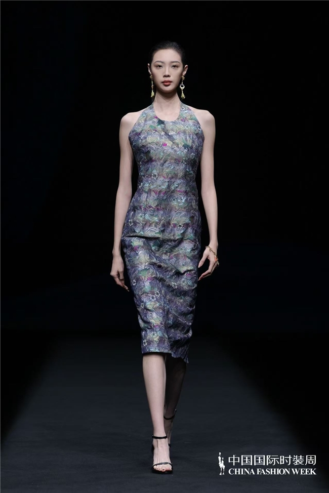“天人合一”的理念贯穿系列设计始终,设计师贺荣摒弃传统纹样的原始堆砌,以留白式疏朗构图与满铺式肌理层次营造丰富视觉层次,将传统元素化作局部应用的巧思与细节装饰的精妙,在服装设计的“皮肤装饰”处做足文章,让东方意境融于现代审美。色彩上以自然色调为基底,从浅绿、浅蓝、米咖的清新雅致缓缓过渡至咖黑的沉稳大气,经典黑白、蓝绿及紫色系交织其间,如自然万象的光影流转,让穿着者在感受自然之美的同时,体悟人生的豁达与从容,实现视觉与心灵的双重滋养。