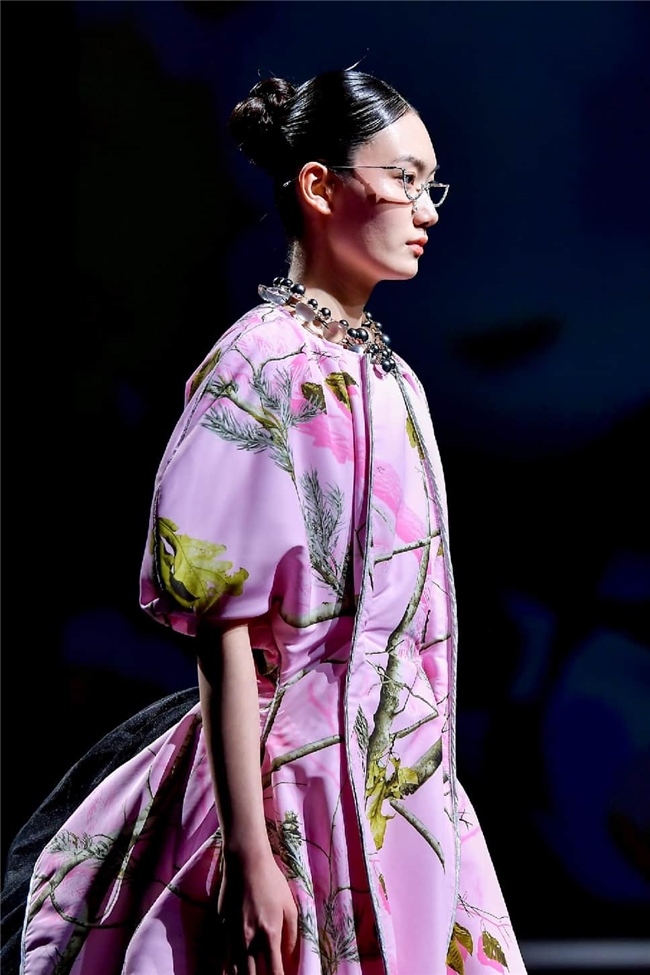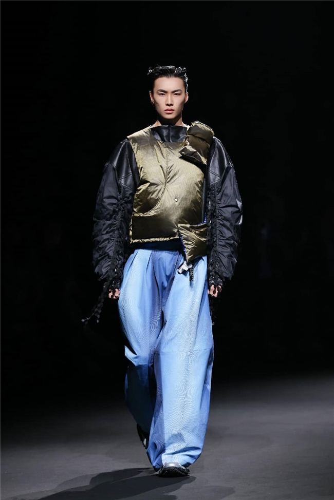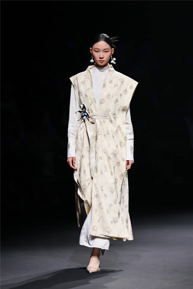 恒信织造通过“流淌”主题,打造出一场兼具东方传统美学与自然休憩感的潮流梦境。包括醋酸在内的一众优质纤维素面料,通过柔润飘逸的质感和充满雅韵的光感,成为温柔与诗意的绝佳载体。部分织物以丝滑触感搭配优雅自然的肌理,显露灵动的韵味,同时利用独特的提花织造工艺,将流水、竹影等意象织就成细腻暗纹,在经纬交错间勾勒流动光影,为服装的叠搭强化梦幻的意趣。一系列表面带有哑光、微皱外观的面料兼具生态可持续属性,搭配生物印染工艺呈现的优雅治愈色彩。为烘托面料的质感,衣角处立体装饰的非遗绒花引发关注,于感性浪漫的氛围中,映衬出静雅的传承之美。