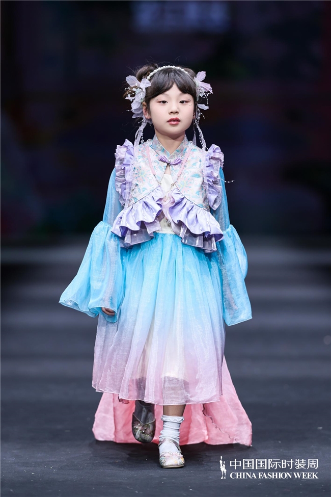 与“春野漫行”所呈现的自然与生活场景不同,“萌骥花马”主题系列将视角转向传统文化语汇在童装中的当代表达。设计师蒋卓君以非遗望江挑花为切入,将其与改良汉服元素相结合,并围绕马的趣味造型、由挑花演变而来的几何纹样以及自然花草元素展开设计,在保留文化意味的同时,也赋予整体更贴近儿童审美的亲和力与轻盈感。