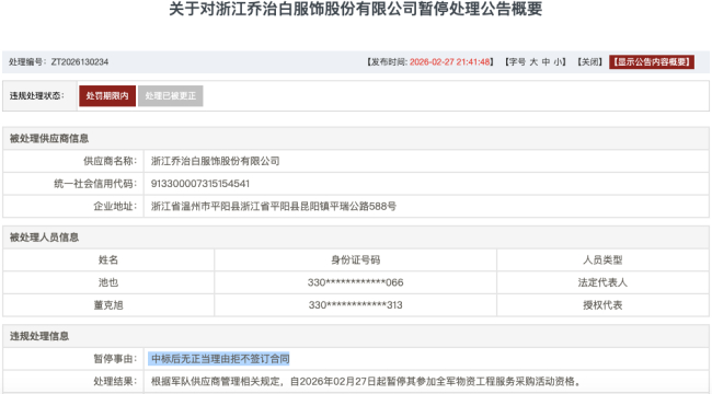 乔治白(浙江乔治白服饰股份有限公司)同样因“中标后无正当理由拒不签订合同”,自2026年2月27日起被暂停参加全军物资工程服务采购活动资格。相关公告披露,其涉及的采购项目编号包括:2024-JQ05-W1972(36)、2024-JQ05-W1972(4)。同时,在暂停期内,法定代表人池也控股或管理的其他企业也被同步限制参与相同范围军队采购活动;授权代表董克旭被限制代理其他供应商参与相同范围采购活动。