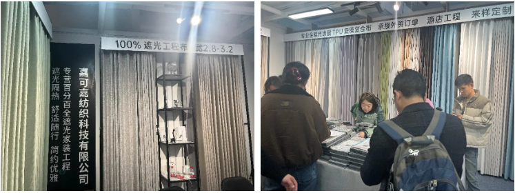 经营加工百分比全遮光窗帘的嘉可嘉纺织科技有限公司,主要承接外贸订单与酒店工程,以外贸业务为主,市场包括韩国、日本以及印尼、马来西亚、泰国等东南亚国家。嘉可嘉纺织总经理凌先生在采访中表示:“作为许村成立十几年的企业,我们知道以前市场这边外国客户是比较少的,这几年展会国际化升级,我们也看到这一利好趋势,选择过来参展,借助展会窗口对接更多外贸客户。我们的窗帘不仅能够做到全遮光,还具备隔音、隔热、抗菌、防紫外线等功能,这次展会反响很好,已经有对接到一些外贸客户了。”