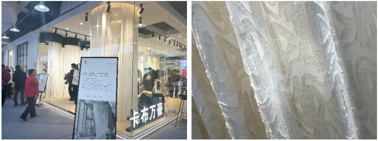 卡布万豪则是一家主打艺术窗纱的企业,产品既有环保透气理念的客厅厚纱,具有鎏金感的轻薄质感卧室纱,也有兼顾实用主义、适用于老钱中古风等风格的性价比优选款,时尚年轻化的小众款,以及韩国进口原料款。卡布万豪总经理汤杰向我们介绍:“我们虽然是主做内销市场的企业,不直接对接外贸业务,但有长期稳定的合作伙伴能够帮助我们把产品卖到海外。这次现场不少海外买家看中我们的产品,我们已经第一时间将联系方式推给了我们的合作伙伴,相信很快会有达成商贸的消息给到我们。”