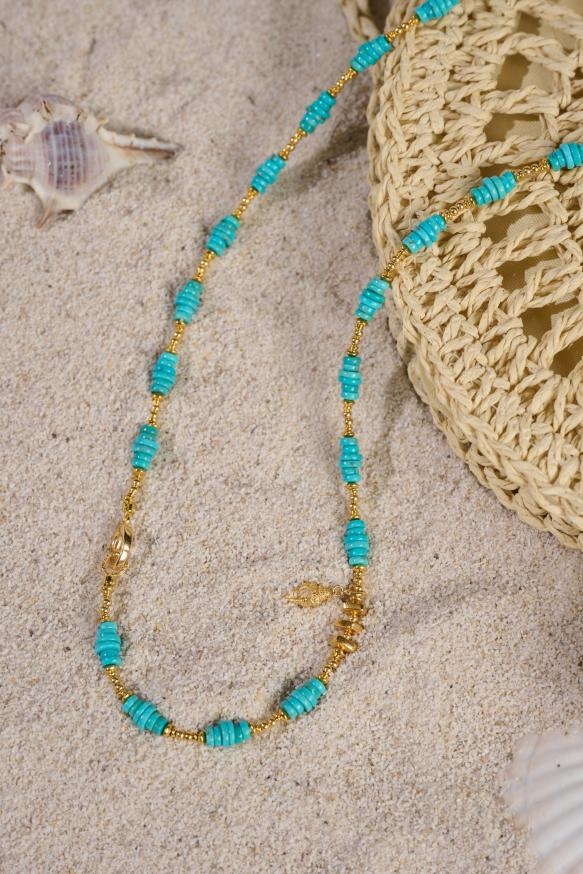 春日的松弛感,藏在山野湖光里,也藏在不刻意的穿搭细节中。计划奔赴山野、湖边或艺术园区的话,“迷迭庄园-圣托里尼松石项链”便是绝佳搭档。松石的清冷蓝调,像把湖光山色戴在颈间,与春日自然格外相衬。5mm+直切扁珠,线条利落干练,比圆珠更具几何感,贴合颈间不臃肿。60cm黄金佩戴长度垂坠至胸口,拉长颈部线条,视觉上显瘦显高。搭配棉麻衬衫或休闲卫衣,清冷蓝调与随性穿搭形成恰到好处地平衡,漫步春日,自带不费力的高级感。