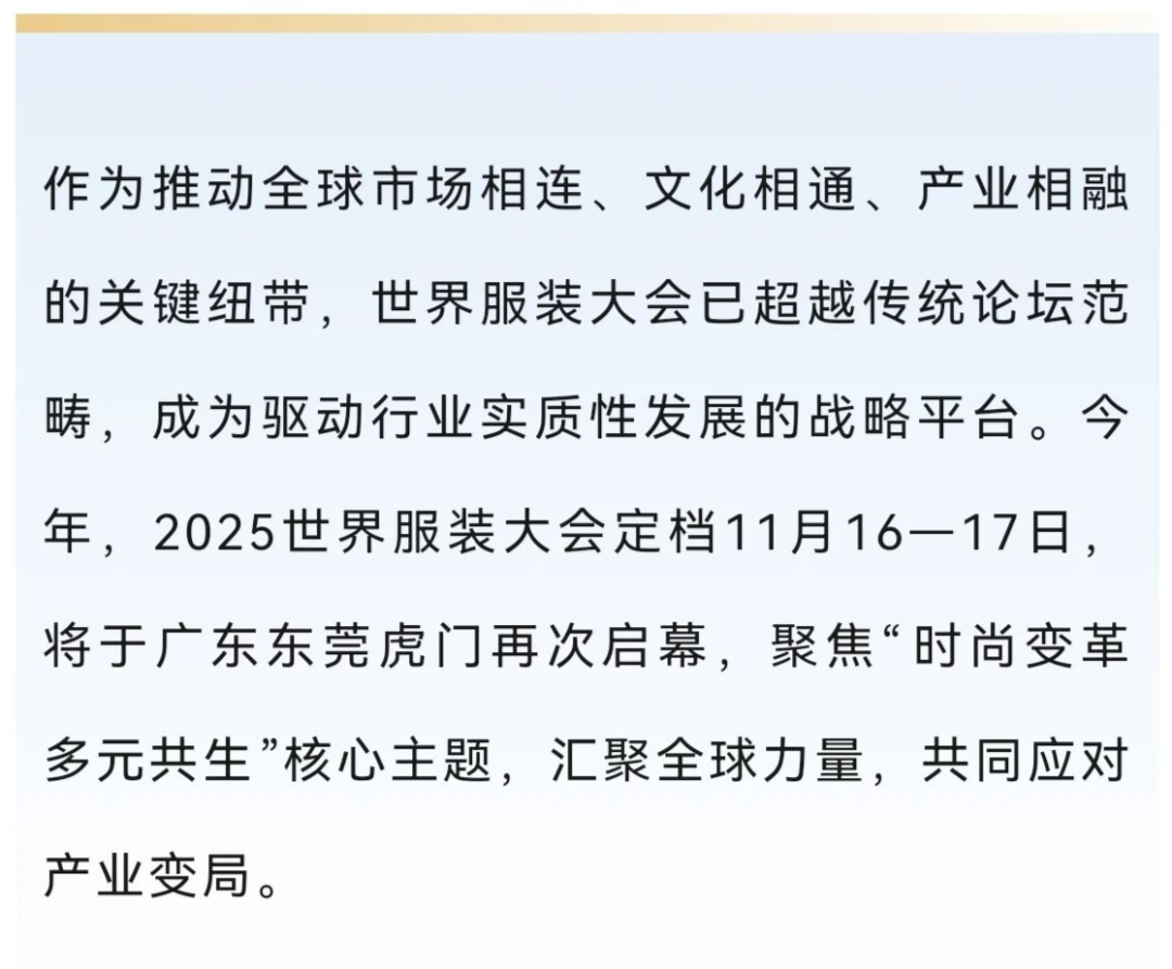 回顾2024世界服装大会,其核心价值已通过多位国内外时尚精英、领军企业家、优秀设计师等的切身经历得到验证——它不仅是观点交锋的创新载体,更是促成商业合作、指引创新方向、凝聚行业共识的产业基石。往届大会提供行业共识与时尚资源的高效链接对于服装及时尚品牌而言,世界服装大会的核心价值在于其无可替代的资源链接能力。2024世界服…